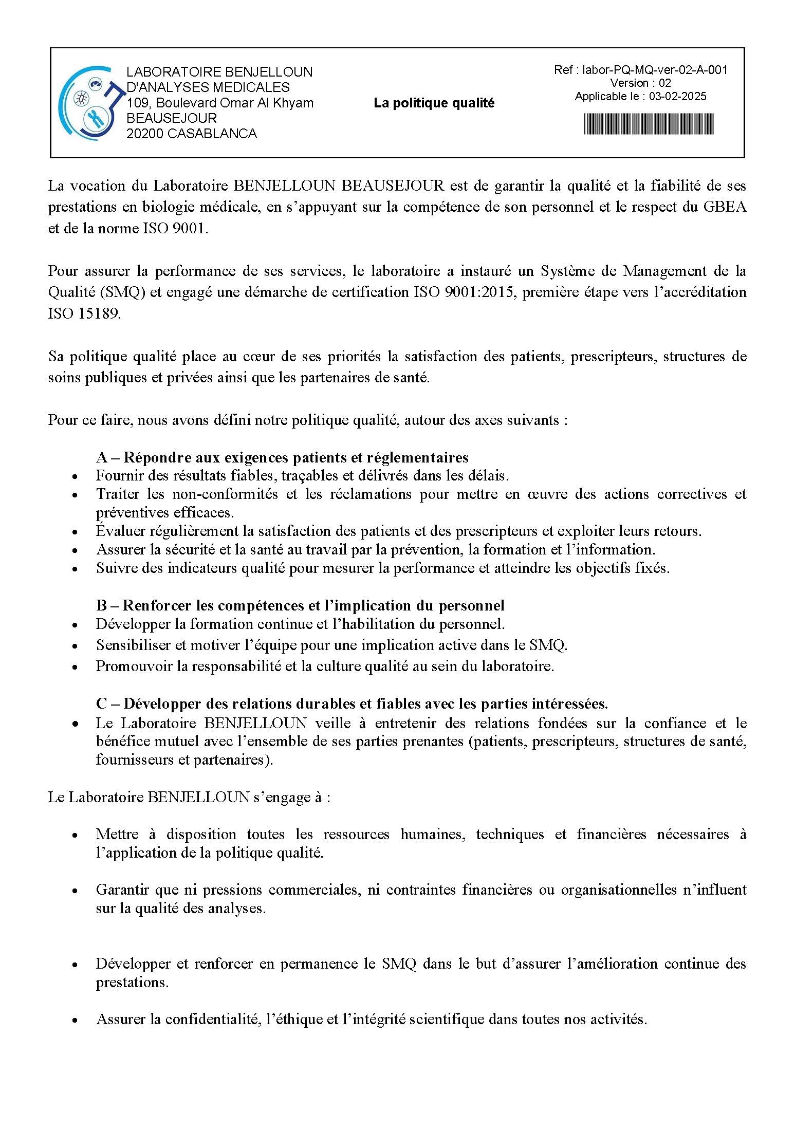 La vocation du Laboratoire BENJELLOUN BEAUSEJOUR est de garantir la qualité et la fiabilité de ses prestations en biologie médicale, en s’appuyant sur la compétence de son personnel et le respect du GBEA et de la norme ISO 9001.