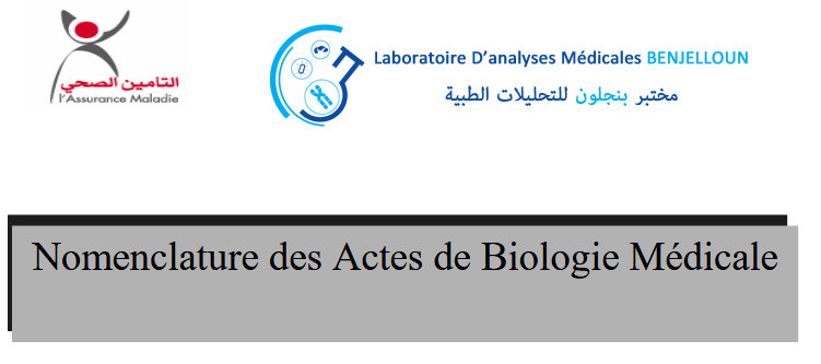 Le laboratoire Benjelloun respecte la nomenclature des actes de Biologie Médicale en cours d'utilisation par l'Agence Nationale de l'Assurance Maladie.